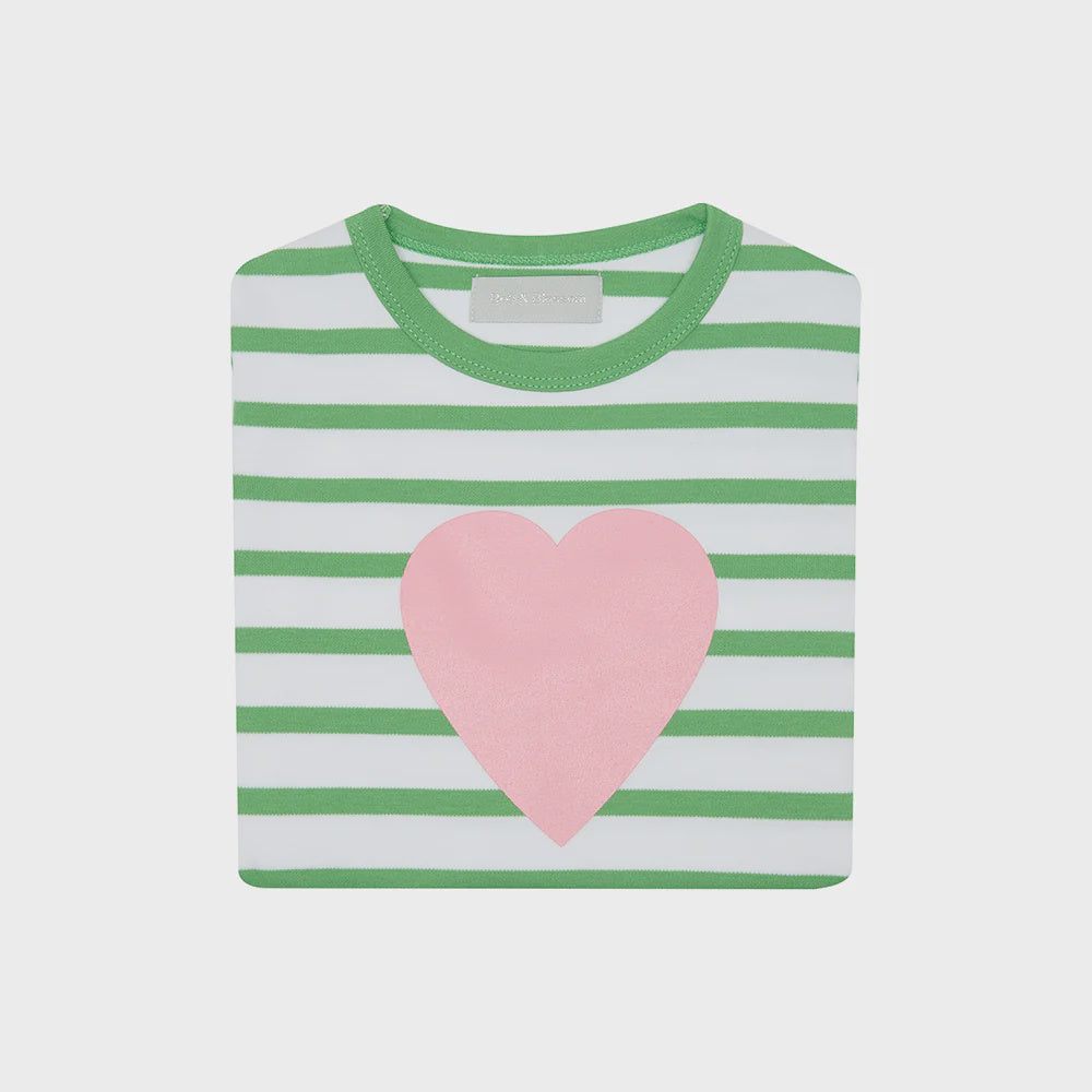 Grass green & white breton striped cotton T shirt, featuring a mallow pink love heart screen print.