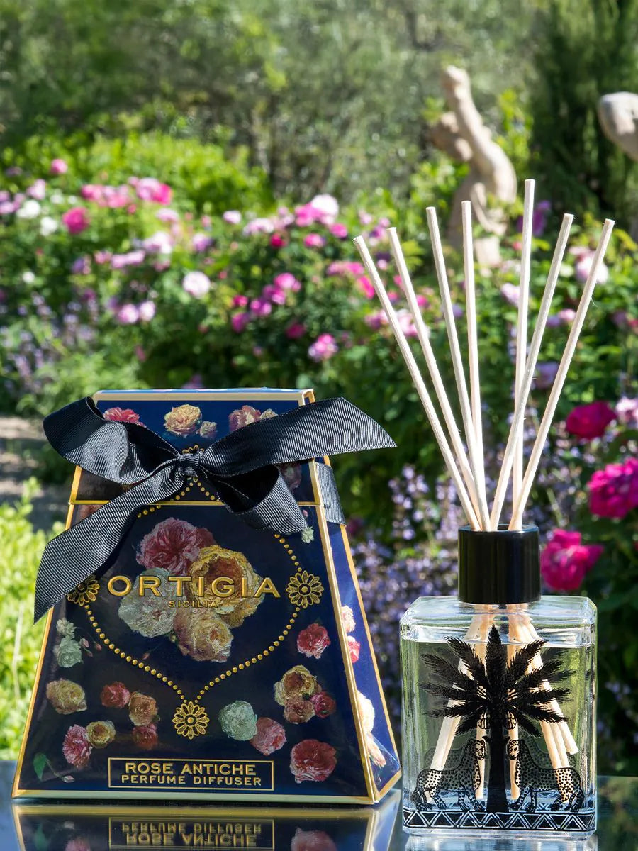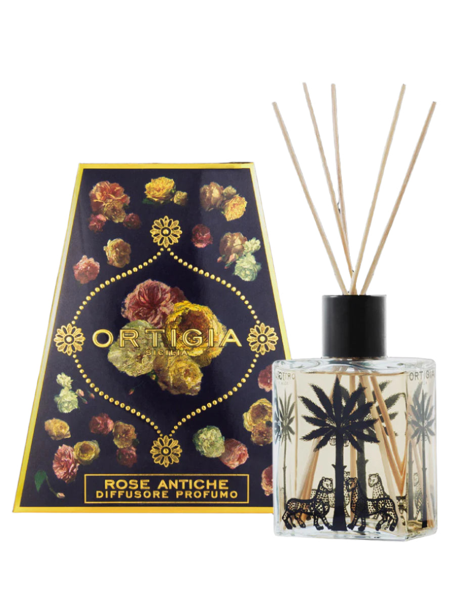 Natural reeds in a lovely signature bottle. The perfumed liquid travels through the sticks, releasing the subtle and continuous fragrance of Damask and Alba roses.