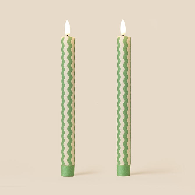 With its lively, undulating lines, the Rick Rack fabric designs are inspired by the ebb and flow of sea currents and tidelines. Wrapped in a fabric of crisp Granny Smith green and soft cream colourway, this flameless LED taper candle adds a fresh pop of colour and warm glow to any space—no wax, no fuss, just effortless charm.