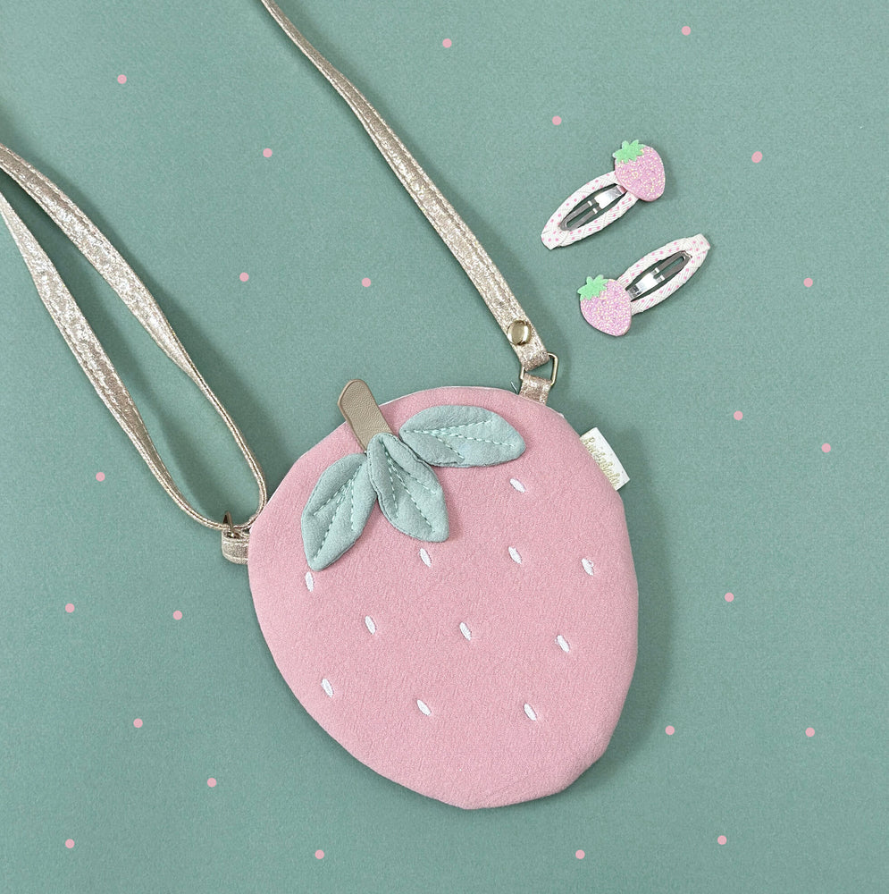 Add a little sweetness to your day with our pretty pink Strawberry Bag! Our fruity shaped bag features leaf detailing and is perfect for keeping your summer essentials safe! Fully lined in our pink spotty fabric, with a magnetic dot closure and an adjustable strap with a break point for safety.
